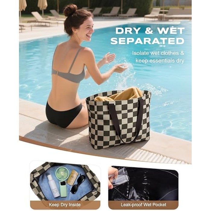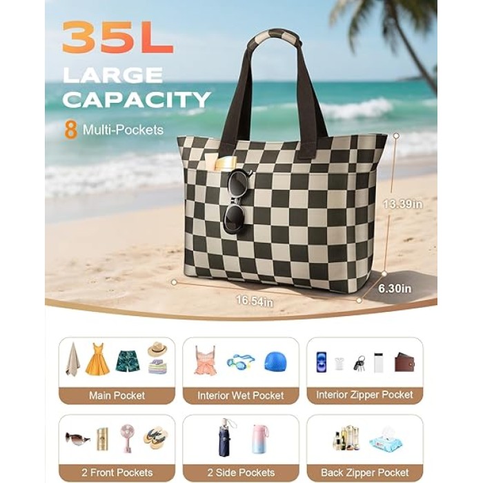 Vewaci 35L Large Beach Bag, Waterproof Sandproof Beach Bags for Women, Beach Tote Pool Bag with Zipper Wet Compartment for Beach, Gym, Daily Commuting, Travel Vacation Essentials (Checkered)