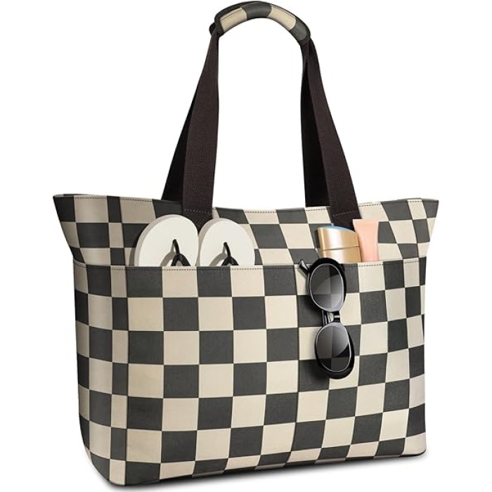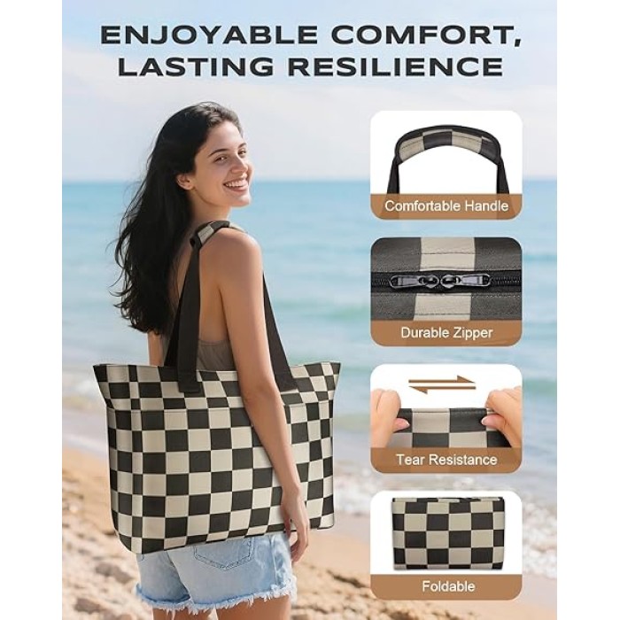 - 【Stylish and Versatile】 Rock the iconic checkered pattern from beach days to city streets! Perfect as a pool bag, shopping bag, travel bag, or fitness bag, the beach tote bag masters pool trips, park picnics, weekend getaways, and daily commutes. Weighing just 0.56lbs, it can be fold compactly, tucking into backpacks or suitcases. Wherever life takes you, chic versatility delivers.