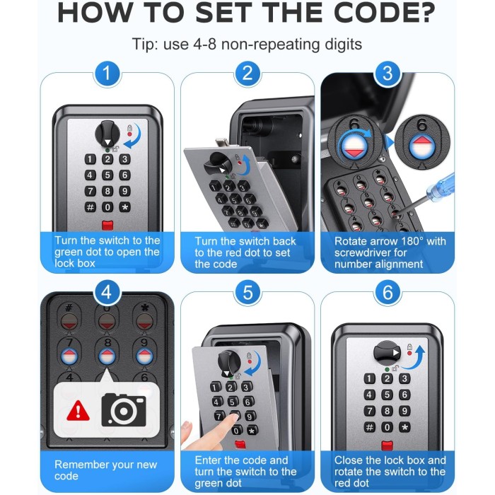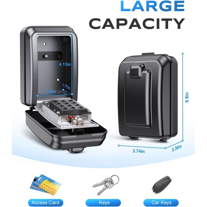 - 【12-Digit Customizable Security】 Embrace tailored security with our 12-digit key lock box! Personalize your exclusive access code from thousands of options. In addition, the larger numeric buttons ensure clear visibility for users of all ages. Pro Tip: 4-8 digits are recommended for optimal security and memorability. Remember to record or take a photo of your code after each time you set it to avoid lockout.