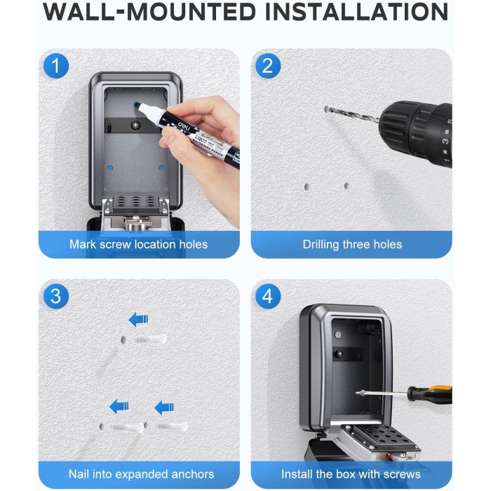 - 【Hassle-Free Installation】 Effortlessly secure your keys with our wall-mounted lock box for keys with code! In just 5 minutes, you can install it on any exterior wall using the provided screws, and extension anchors. Clear step-by-step instructions ensure smooth setup on walls, doorways, or any other preferred location.
