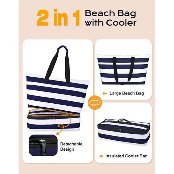- 【Detachable Cooler Bag】 Upgrade your seaside adventures with our beach bags for women! Featuring a detachable double zipper design, it allows you to easily separate the beach bag and cooler bag. The insulated cooler keeps drinks chilled for hours (add ice packs for extended chill), and the leak-proof liner prevents water from seeping out when ice melts. In addition, it's versatile enough that you can also use it for wet swimsuits and flip-flops.