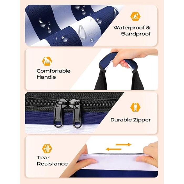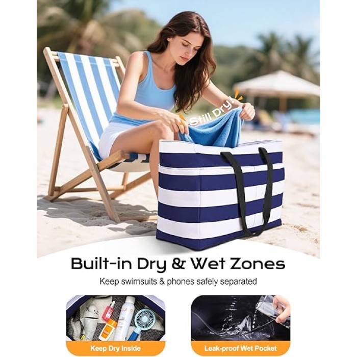 - 【Stylish and Versatile】 These timeless striped beach bags waterproof sandproof are your ultimate companion for every adventure, whether it's the beach, gym, swim pool, boat, or short trip. Combining practicality with fashionable design, it is not just a bag—it's a women beach fashion. It's perfect for women, baby, kids, or family.