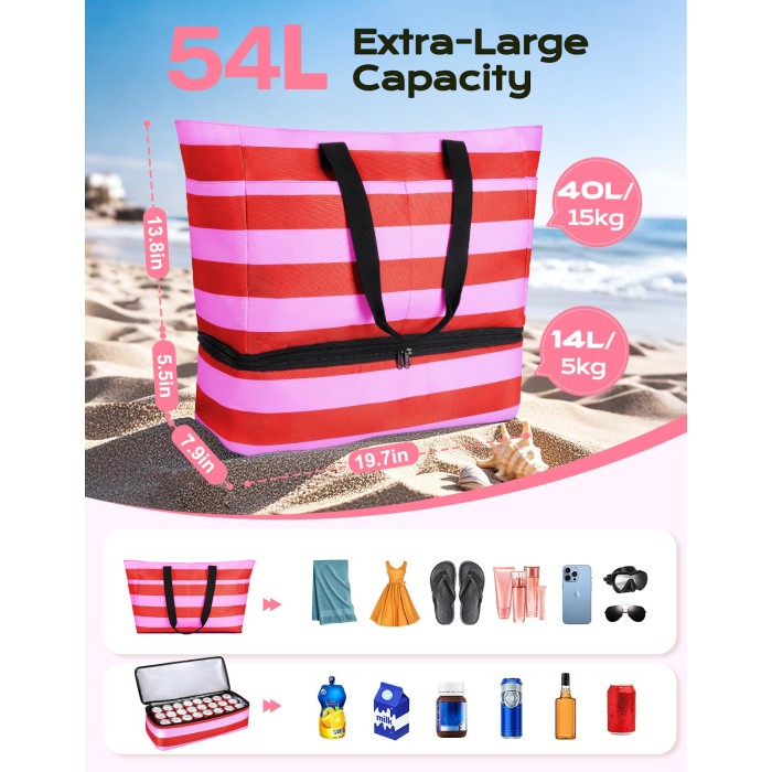 - 【2-in-1 Large Beach Bag】 Explore the ultimate beach companion! Our beach bag (19.7"x7.9"x19.3") features 9 specialized pockets: 1 detachable cooler, 4 quick-grab outer slots, 1 external zipper pocket, 2 internal zipper pockets, and a leak-proof wet zone to easily handle the beach chaos. With a 54L large capacity, it holds 4-6 towels, clothes, flip-flops, umbrellas, sunglasses, snacks, and more – perfect for family outings or solo travels.