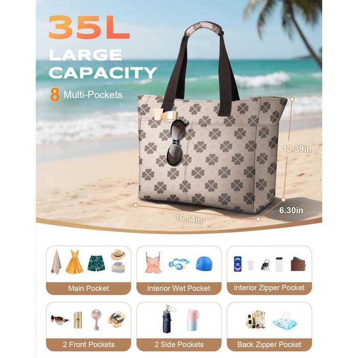Vewaci 35L Large Beach Bag, Waterproof Sandproof Beach Bags for Women, Beach Tote Pool Bag with Zipper Wet Compartment for Beach, Gym, Travel Vacation Essentials (Four-Leaf Clover)