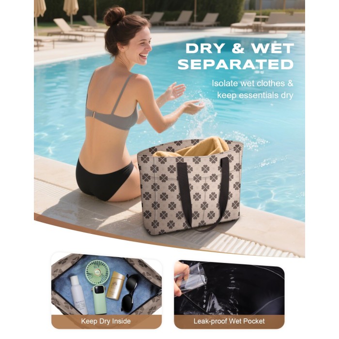 【Dry & Wet Segregation】 Isolate Dampness, Preserve Dry!Featuring a dedicated leak-proof compartment with watertight zipper closure, this pool bag actively contains wet swimsuits, or towels —blocking moisture transfer to keep other items pristine. The expanded spacious design accommodates bulkier wet/dry separation. Organize effortlessly, stay hygienically fresh!